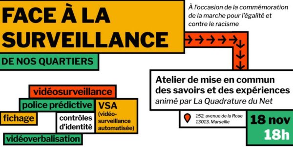 Samedi 18 novembre à 18h, rendez-vous dans le 13è arrondissement de Marseille pour un atelier animé par la Quadrature du net sur la surveillance numérique policière de nos quartiers, dans le cadre de la commémoration de la marche pour l'égalité et contre le racisme.