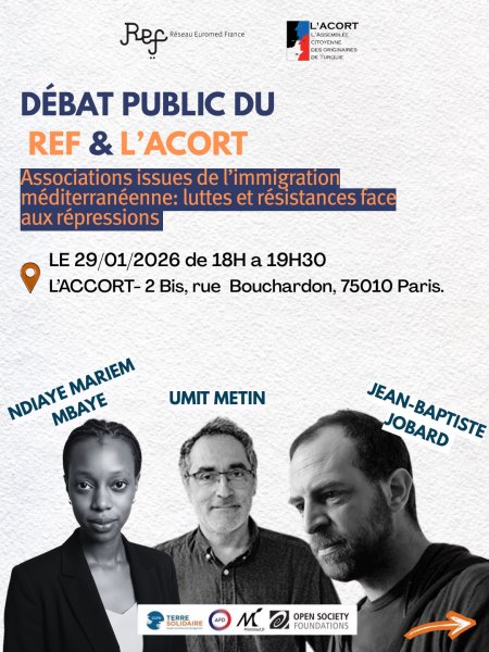 Jeudi 29 janvier à 18h Paris 10 - débat public ACORT/REF à l'occasion de la sortie du dernier numéro de la revue du REF (Réseau Euromed France) qui présentera son Cahier n°10 intitulé « Fractures françaises, espoirs méditerranéens : luttes citoyennes et héritages de l’immigration ».