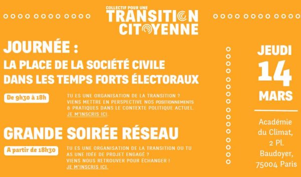 Comme annoncé et présenté dans notre dernier courriel d'infos, nous vous invitons en partenariat avec le CAC (Collectif des Associations Citoyennes) à une rencontre "Renforcer la société civique" afin de prioriser les enjeux au regard de l’état présent et futur de notre société, de préciser les chantiers à démarrer et d'envisager un dispositif de coopération entre organisations de la société civique.