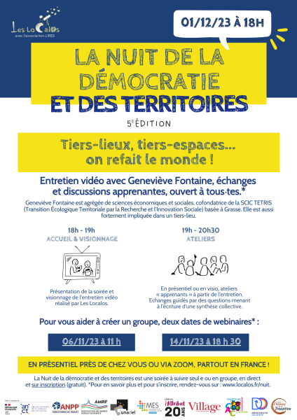 La cinquième édition de la Nuit de la démocratie et des territoires aura lieu le vendredi 1er décembre 2023 à 18 h à partir d'un entretien avec Geneviève Fontaineautour du thème « Tiers-lieux, tiers-espaces... on refait le monde ! ». Depuis 2019, l'association Les Localos et l'association LIRES vous proposent de venir, letemps d'une soirée, échanger et débattre autour d'un sujet portant sur la démocratie locale, le développement local ou encore la transition écologique.