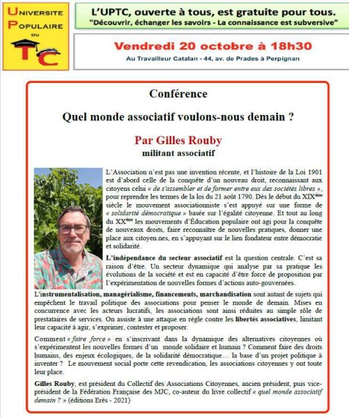 - Le ven 20 octobre le CAC en la personne de son président Gilles Rouby, est l'invité de l'Université Populaire de Perpignan (66) à 18h30 pour porter la conférence "quel monde associatif voulons nous demain ?"