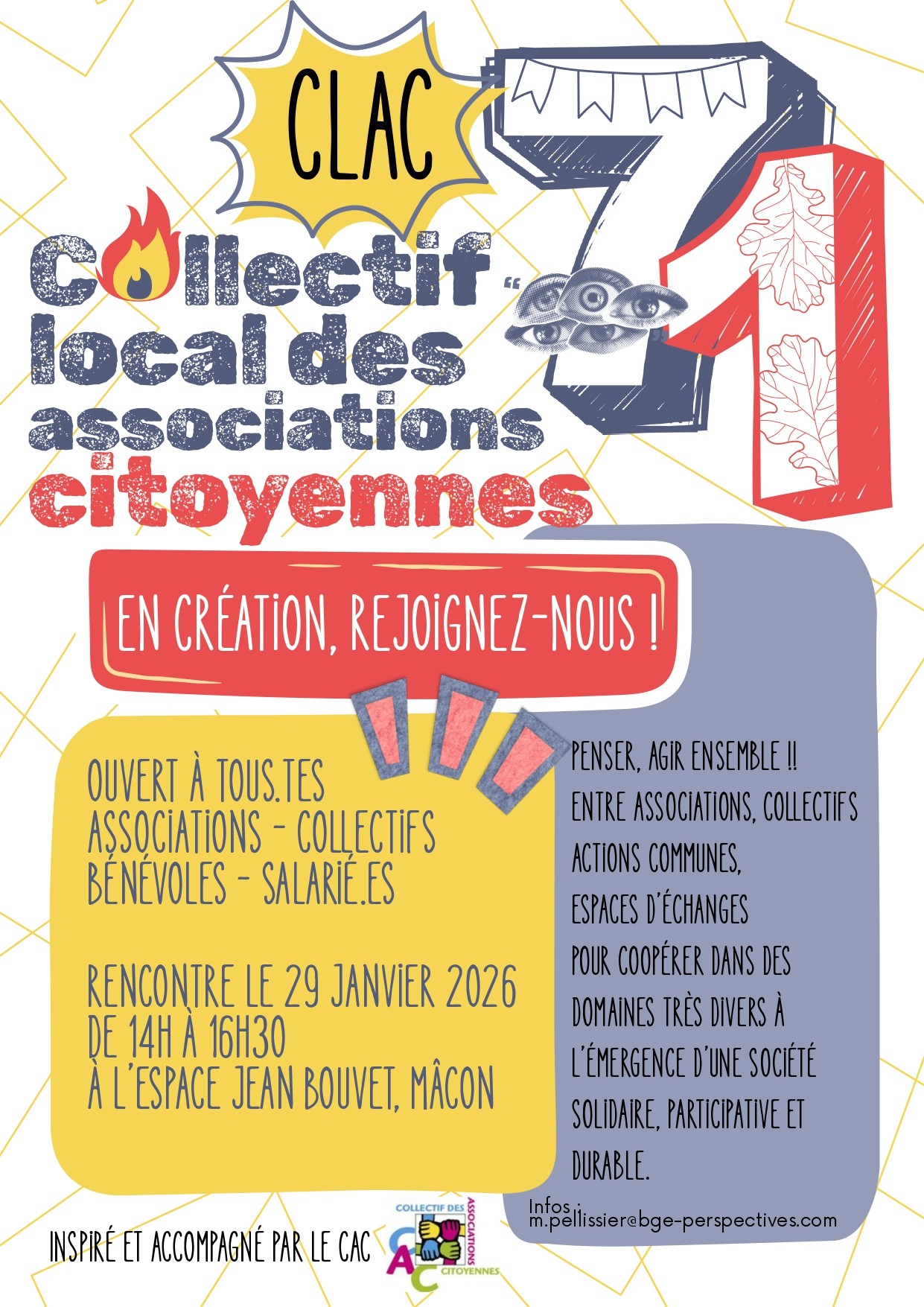 Le CLAC71 - Collectif Local des Associations Citoyennes 71 - a été créé en mai 2025, suite à plusieurs rencontres inspirantes animées par le CAC.Ce collectif est ouvert à toutes les associations de Saône-et-Loire.