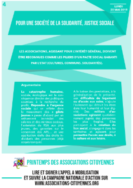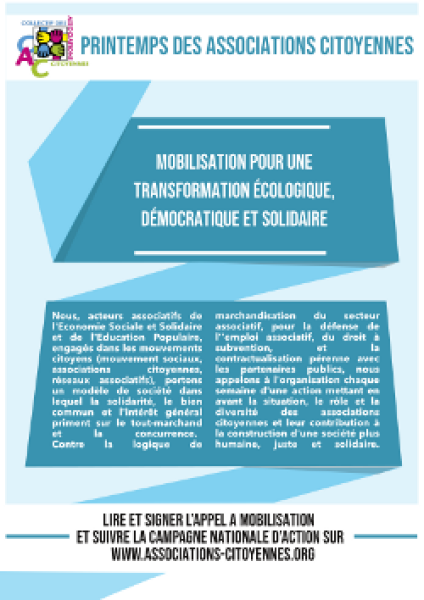 Associations Citoyennes, nous représentons une force, une dynamique, une capacité d'innovation inouïe. Par notre organisation, notre expérience accumulée, les enjeux que nous portons, chacune à notre niveau nous construisons cette société Solidaire, Ecologique, Démocratique. Nous sommes Nuit Debout !, les Marches pour le Climat, les acteurs de la solidarité, les défenseurs des droits et de la dignité humaine. Nous sommes les Associations Citoyennes.