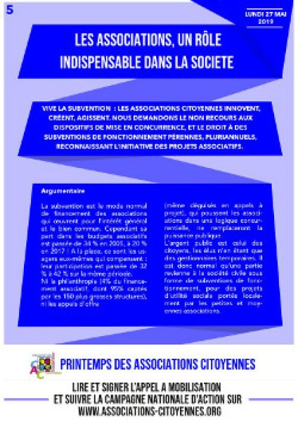 D’un autre côté une multitude de petites associations se voient retirer petit à petit l’appui de l’État, et les collectivités locales ne peuvent plus compenser ces manquements. Ces associations qui créent un maillage territorial quotidien, au plus près des gens, et assurant des fonctions indispensable à la vie en société (action culturelle, maintien du lien social, vitalisation des territoires ruraux ou urbains, éducation à l’environnement…) perdent leur capacité à agir dans le long terme, demandant une implication de plus en plus forte de bénévoles eux-mêmes en difficulté face aux lourdeurs des dossiers administratifs.